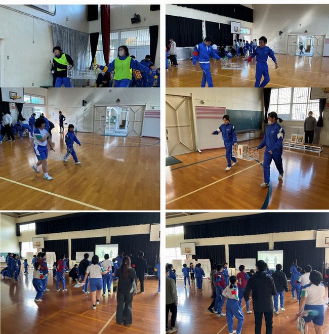 ゲームの『動物を運ぼう』では、グループごとに、高等部の先輩を中心に作戦をたてて、手をつないで動物を運び、チームの仲を深め合ったり、きまりやルールを守りながら速さを競い合ったりしてゲームを楽しみました。