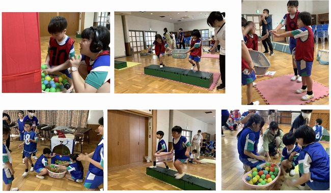 同じチームの友だちと一緒に、おやつ(ボール)が入ったかごをキャラクターの所まで運び、相手のチームより早くおやつを食べ終わるよう、素早くキャラクターの口におやつを入れていました。友だちのペースにあわせてかごを運ぶ姿がたくさん見られました。
