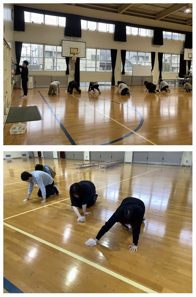 今回の点検では、毎月の安全点検(目視)では発見できないササクレやひび割れをみつけられるように、教員が横に並んで、不織布を手に付けて床を拭き、引っ掛かりがないか触診による点検を行いました。